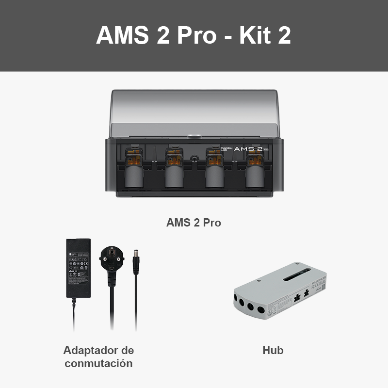 - Contenido de la caja: Bambu AMS 2 Pro, desecante, tubo de PTFE, cable Bambu Bus de 6 pines.