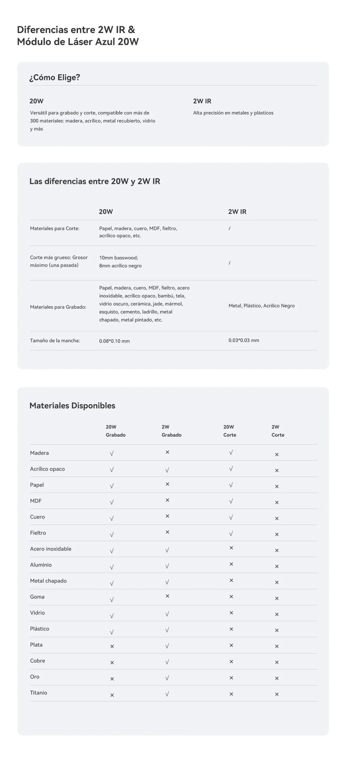 - Láser azul de 20W: Corta madera de tilo de 10 mm, acrílico negro de 8 mm y lámina de acero inoxidable de 0.04 mm. Velocidad de hasta 600 mm/s.