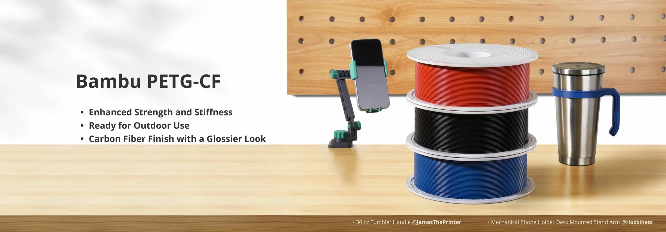 El PETG-CF de bamb煤 es un material compuesto de PETG y fibra de carbono. La nueva f贸rmula mejor贸 considerablemente la calidad de impresi贸n al reducir la obstrucci贸n y la formaci贸n de grumos en las boquillas en comparaci贸n con el PETG tradicional. Con la adici贸n de fibra de carbono, el PETG-CF de Bambu ofrece una resistencia mejorada a la vez que mantiene una buena tenacidad y un aspecto brillante. Es un material ideal para piezas de drones, modelos de carreras y diversas piezas funcionales que requieren un alto rendimiento, especialmente resistencia al impacto, y una apariencia elegante.