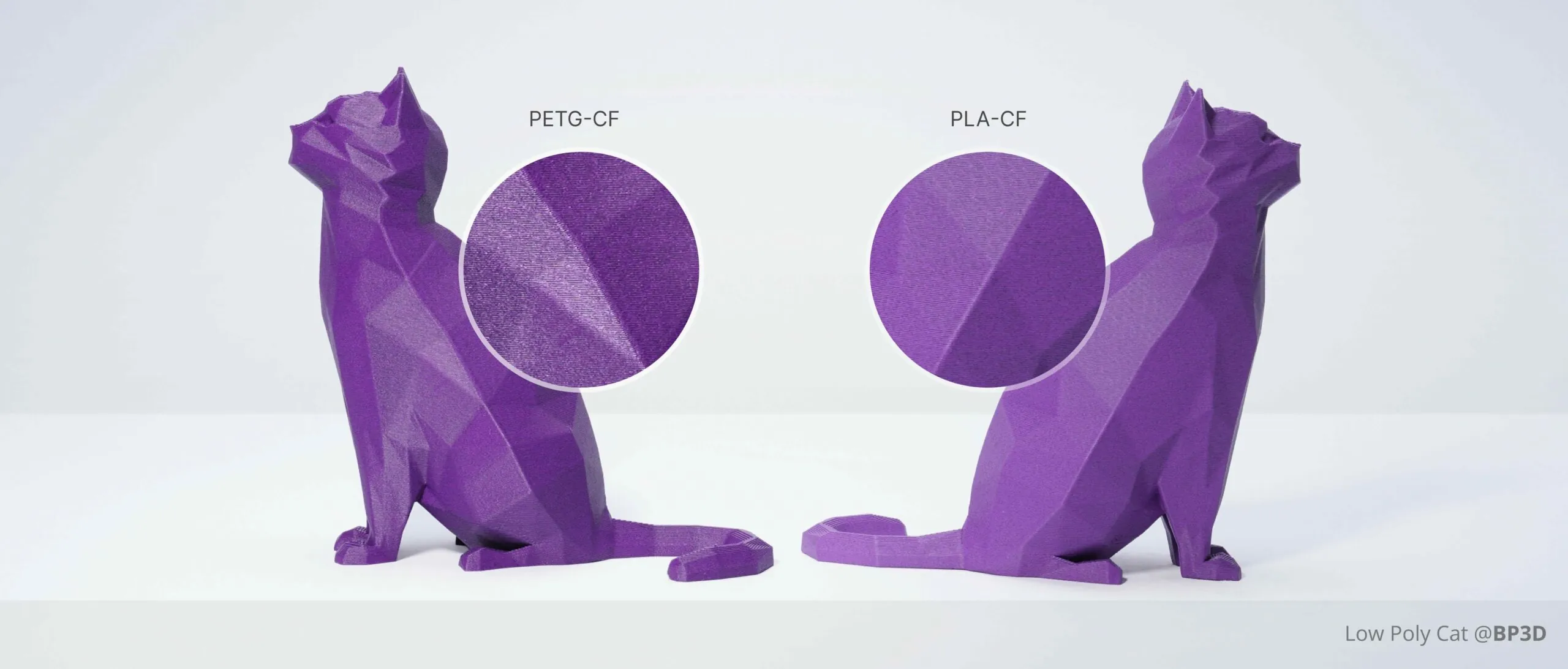 A diferencia del acabado mate de PLA-CF, PETG-CF ofrece un acabado brillante y, por lo tanto, una opci贸n m谩s.
