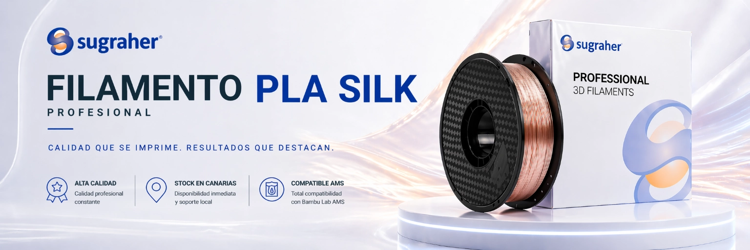 A diferencia de otros PLA Silk del mercado, este filamento ha sido testado por Sugraher para garantizar estabilidad y repetibilidad, evitando problemas habituales como subextrusión o inconsistencia en brillo.