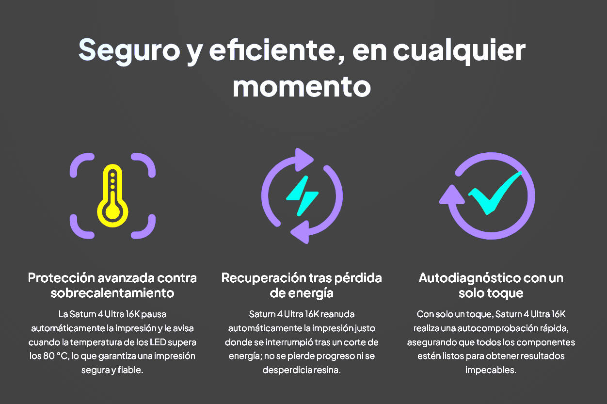 Gracias a un sensor mecánico inteligente, la Saturn 4 Ultra 16K detecta residuos para evitar daños en la pantalla LCD. Además, las alarmas que avisan puntualmente cuando hay escasez de resina o fallos de nivelación minimizan el desperdicio y garantizan una eficiencia continua.