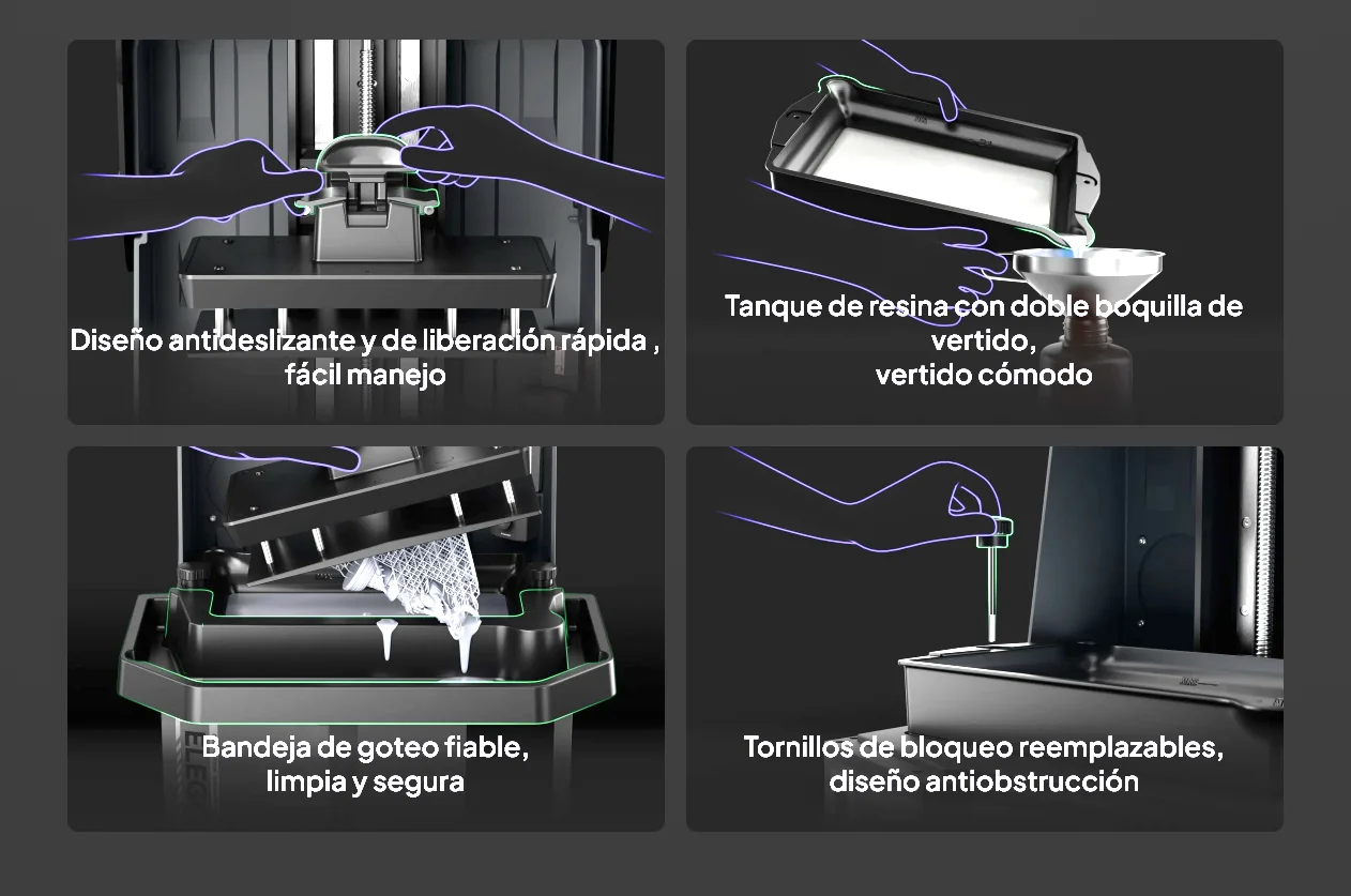 La Saturn 4 Ultra 16K incorpora tecnología avanzada de liberación por inclinación, que permite un despegado rápido y sencillo del modelo. Con velocidades impresionantes de hasta 150 mm/h, podrá dar vida a sus diseños más complejos en un instante, garantizando una calidad y un detalle inigualables en cada impresión.