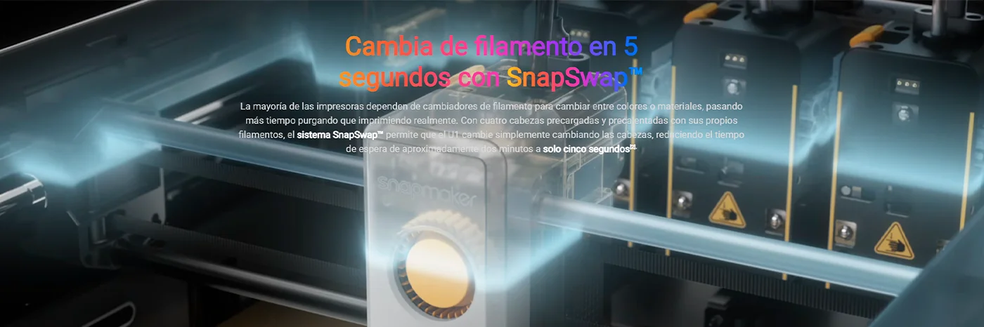 La Snapmaker U1 es una impresora 3D profesional multicolor y multimaterial, diseñada para ofrecer velocidad, precisión y eficiencia de filamento en proyectos complejos y creativos. Gracias a su innovador sistema SnapSwap, los cuatro cabezales de impresión independientes pueden intercambiarse en segundos, eliminando largos tiempos de purga y reduciendo el desperdicio de filamento hasta en un 80%. Esta característica permite crear modelos multicolor y multimaterial de alta calidad con materiales como PLA, PETG, TPU y ABS, desde prototipos funcionales hasta piezas artísticas detalladas, optimizando tiempo y recursos sin comprometer la consistencia de cada impresión.