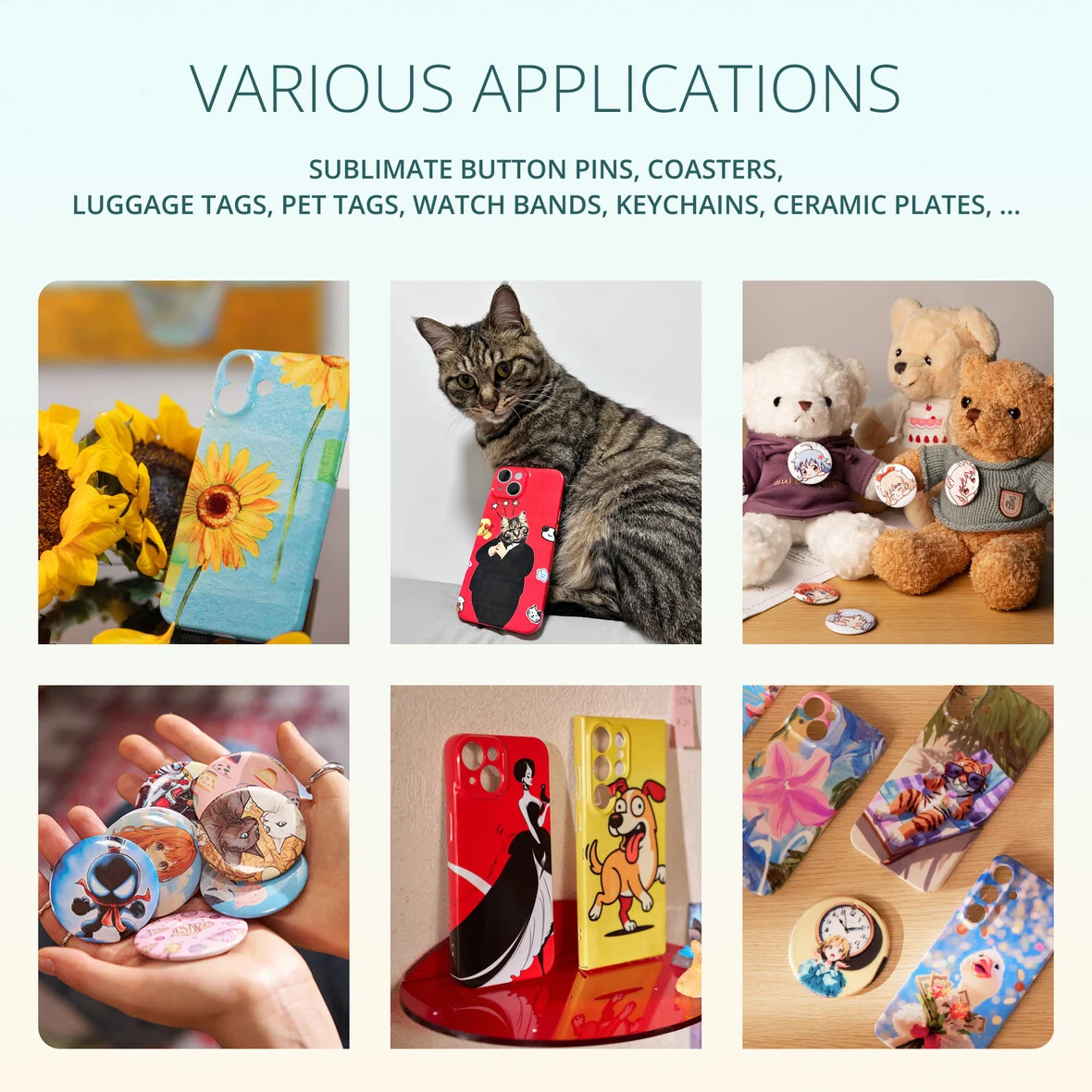 No es sólo una máquina para fundas de teléfono; es una versátil prensa térmica que abre un sinfín de posibilidades creativas. En cuestión de minutos, puedes personalizar una amplia gama de pequeñas piezas en bruto, como: