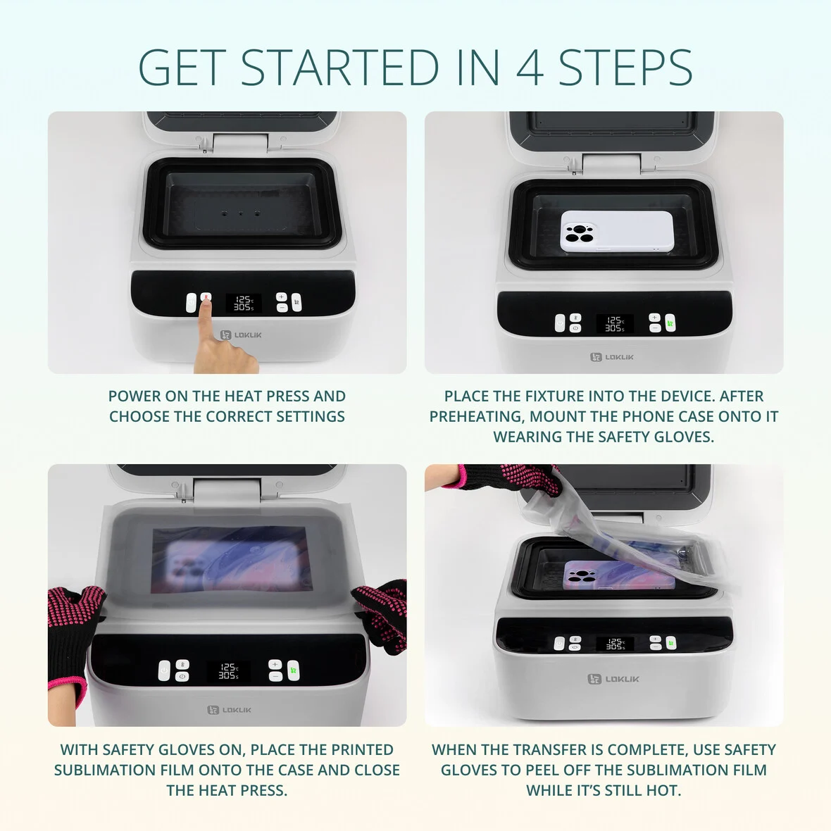 Transforma fundas de teléfono en creaciones personalizadas con la LOKLiK Phone Case Heat Press. Esta prensa térmica de sublimación proporciona diseños vibrantes y duraderos en fundas de teléfonos iPhone y Android y otras pequeñas piezas en blanco. Consigue resultados de calidad profesional y cobertura total en cuestión de minutos.