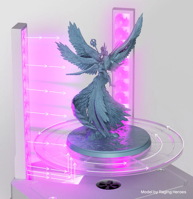 La máquina presenta un plato giratorio giratorio de 360 ° con 24 poderosas luces UV de 405 nm, asegurando un curado rápido, incluso que captura cada detalle sin problemas.