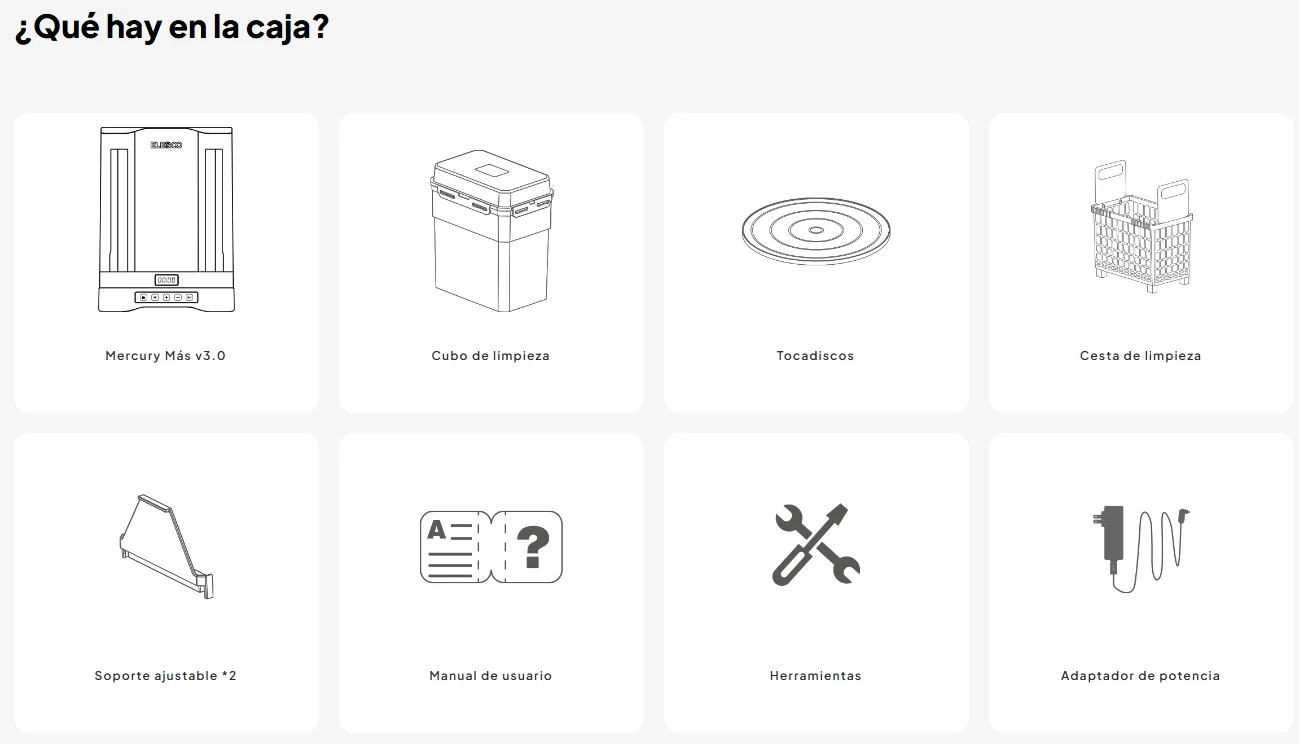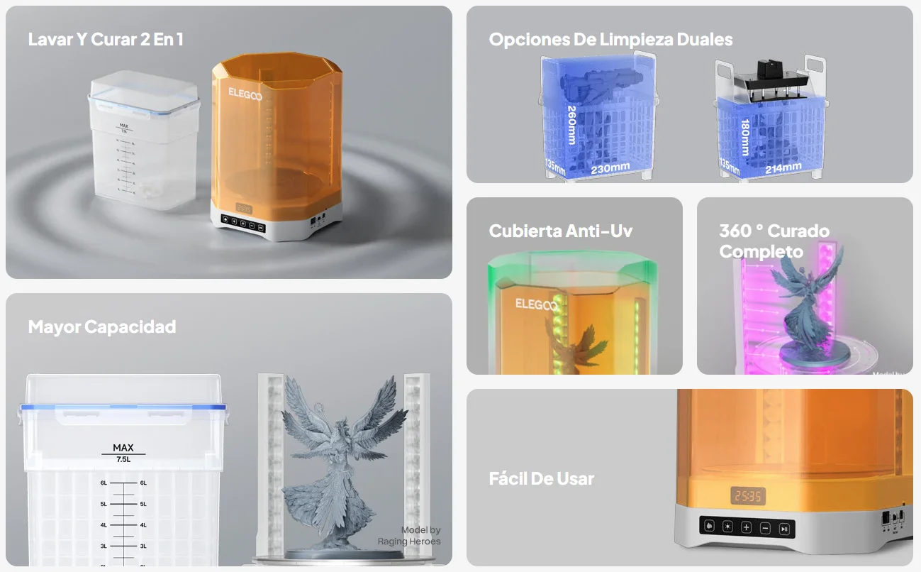La Elegoo Mercury Plus V3.0 es una estación 2 en 1 para lavar y curar impresiones de resina, con mayor capacidad que versiones anteriores y compatible con la mayoría de impresoras LCD/DLP/SLA del mercado. Ofrece limpieza dual, curado 360° con luces UV para acabados completos y un manejo sencillo gracias a su panel táctil e interfaz intuitiva.